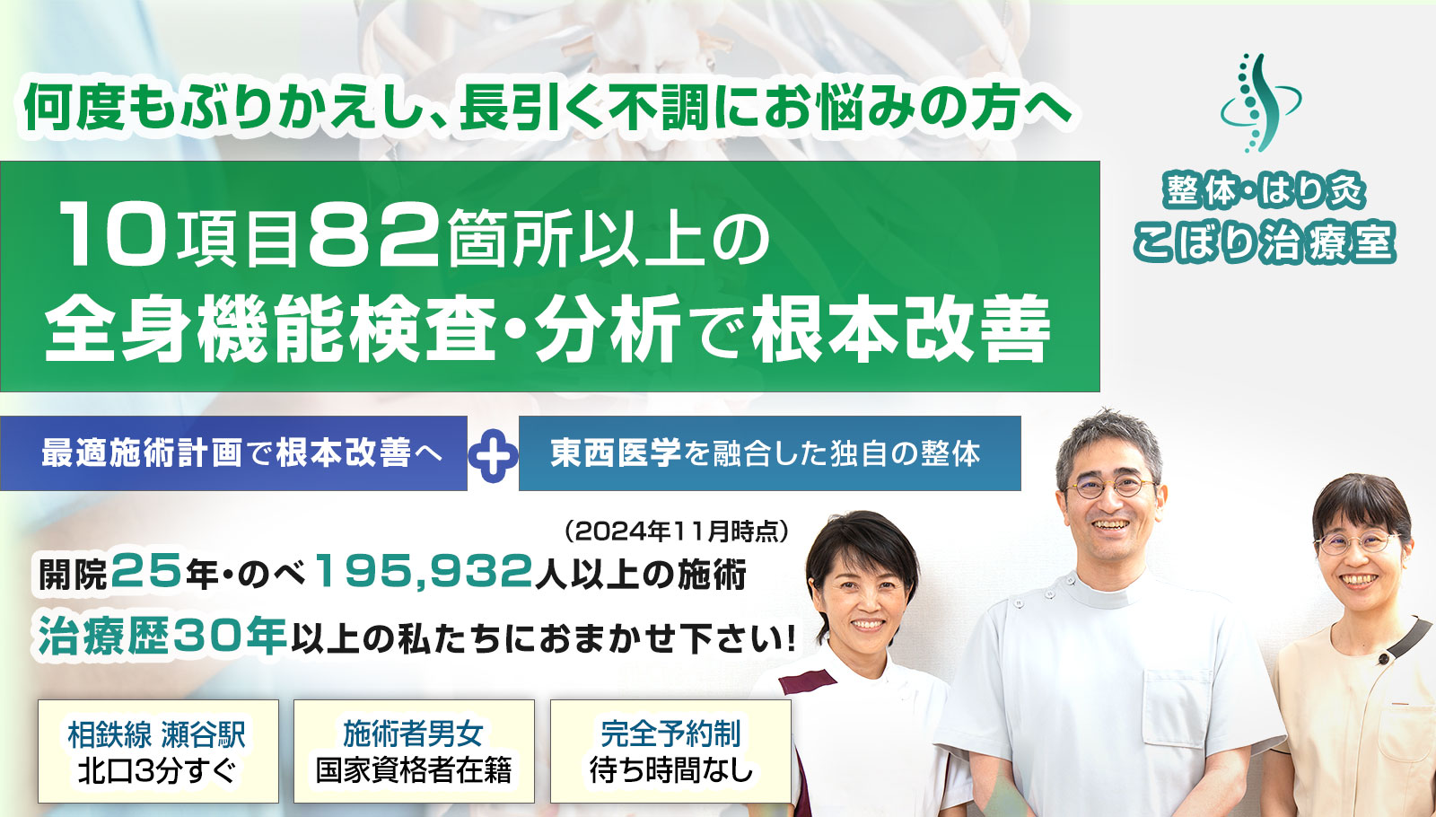 当院は、お一人おひとりに十分な時間をかけ、質の高い施術を提供するために「完全予約制」としております。待ち時間なく、リラックスして施術を受けていただくための環境づくりにご理解をお願いいたします。
