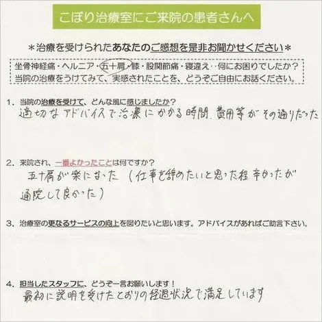 最初に説明を受けた通りの経過で楽になり満足しています。