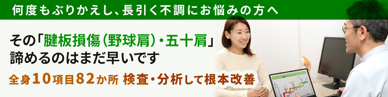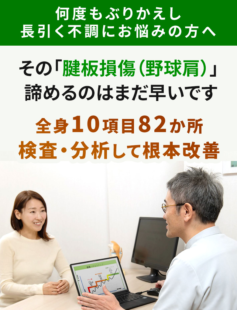 - あなたの腱板損傷(野球肩)・五十肩の痛みの本当の原因を見つけ出し、根本からの改善を目指します。