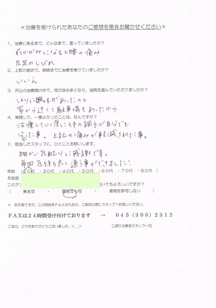 自分でも調子が良くなるのを実感でき、腰痛・足のしびれも楽になりました。治療は細かい気配りをして頂き気分良く通うことが出来ました。