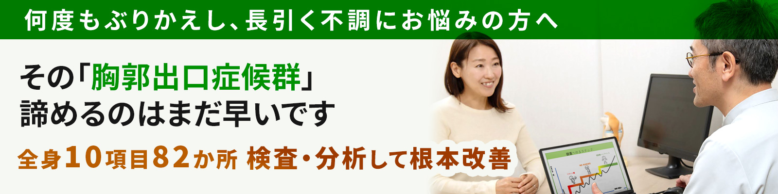 - あなたの胸郭出口症候群りの痛みの本当の原因を見つけ出し、根本からの改善を目指します。