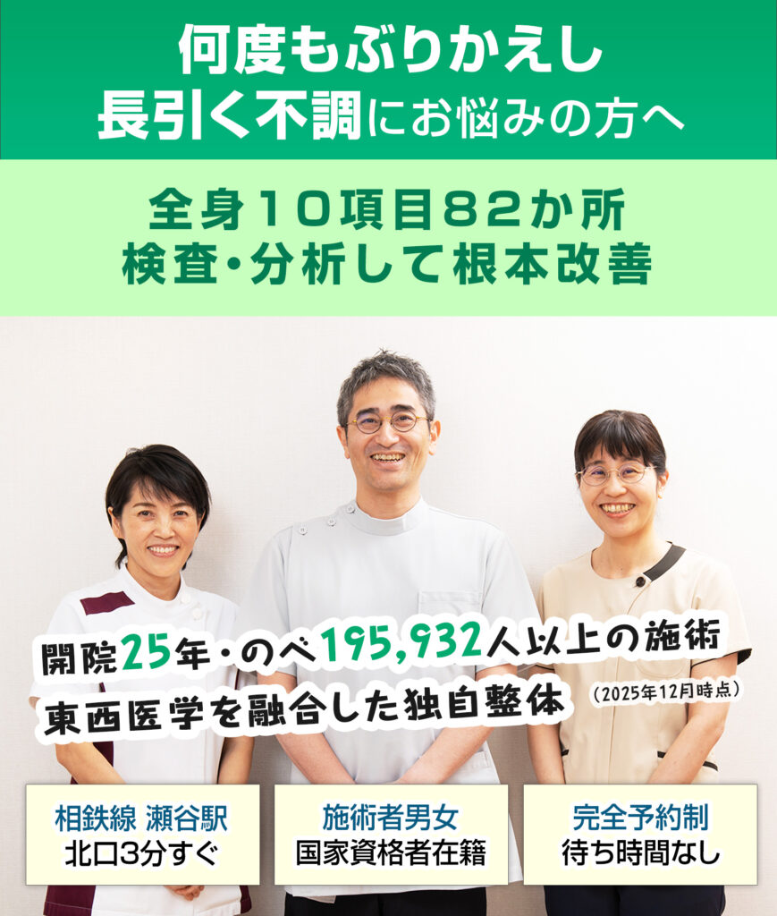 当院では、全身を詳しく検査し、症状の根本原因を特定します。 そのため、一般的な目安ではなく、検査結果に基づいて、あなたに合わせた最適な施術計画を具体的にご提案できます。