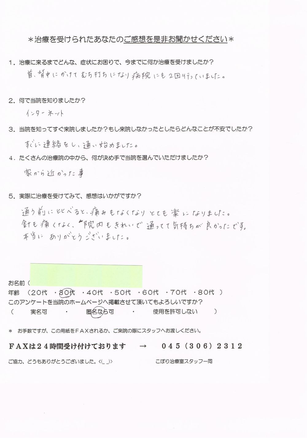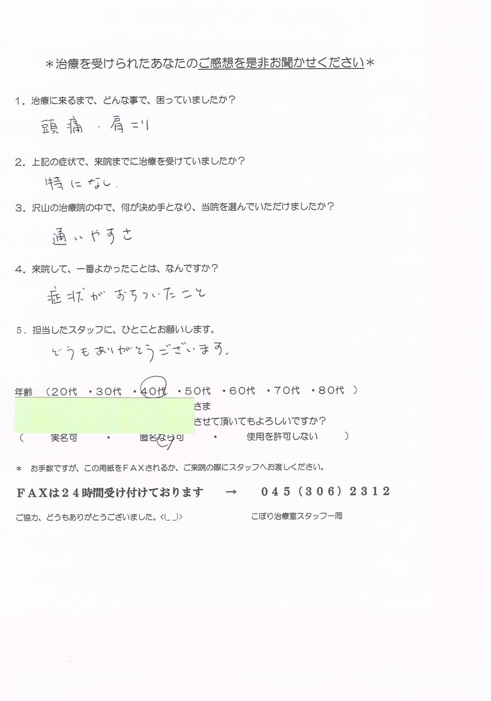 (横浜市港南区 30代女性 肩のひどいコリ)