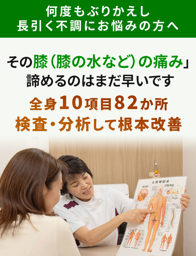 長引く膝(膝の水など)の痛みの根本原因を見つけ、改善します
