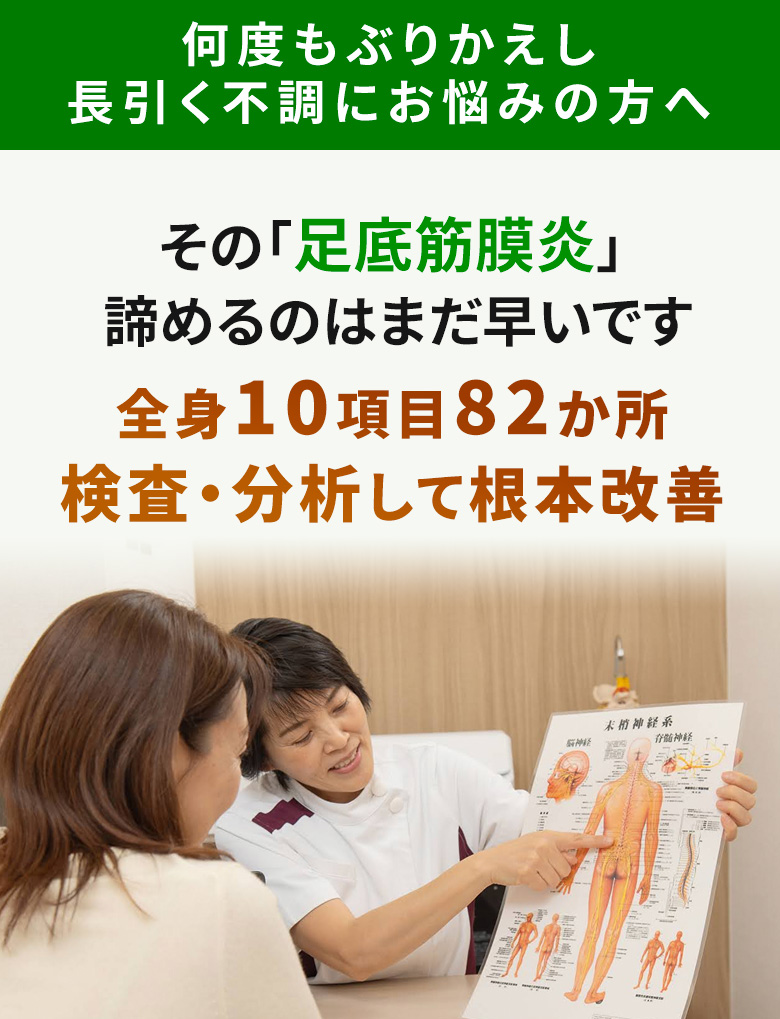 - あなたの足底筋膜炎による足の裏の痛みの本当の原因を見つけ出し、根本からの改善を目指します。
