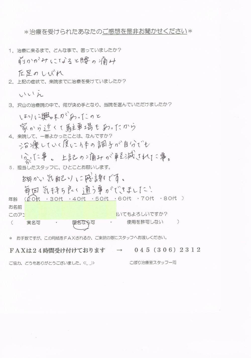 前かがみになると、腰が痛む状態が続き、最近では左の足がしびれるようになってきましたので、はりに興味があったのと自宅から近くお世話になりました。