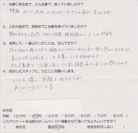 アンケートにご協力ありがとうございます。ヘルニアなんですけど・・・とても心配そうにいらした様子印象深く覚えています。
